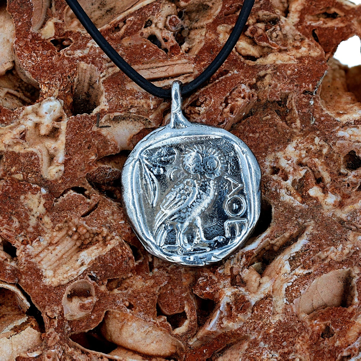 The Glaukes is the perfect illustration of nature on ancient objects. This is no doubt why this ancient coin design is one of the most popular and expensive to collect today. The Glaukes pendant, which means owl in Greek, is molded from the design of an ancient Greek tetradrachm from roughly 450 BC. This piece is cast in a luminous oxidized sterling silver. and hand finished to perfection.