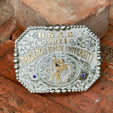 Not only does the Dublin Belt Buckle serve as a symbol of Tarleton State pride, but it is also allowed during official ceremonies, including the revered ring ceremony at the Tarleton. Embrace the tradition, celebrate the achievement, and wear your allegiance proudly with this handcrafted masterpiece – the Dublin Handmade Belt Buckle for Tarleton State University.