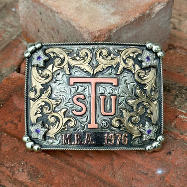 This belt buckle is a true testament to craftsmanship, as each piece is carefully handmade to ensure unparalleled quality and attention to detail. This unique Tarleton State belt buckle design has a base and border of German silver with raised scrolls in jewelers' bronze and the central logo and words in copper. Set into the florets are purple CZ's. This buckle is approximately 4.5 x 3.5 inches.
