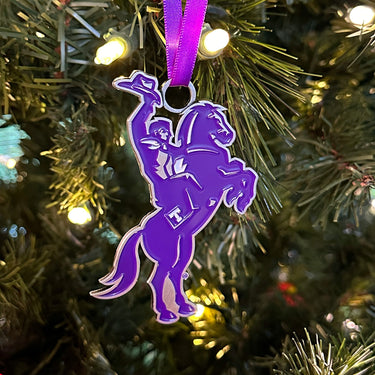 Celebrate your Tarleton pride this holiday season with our exclusive Tarleton Rider Holiday Ornament. Crafted from durable metal and enameled with bright Tarleton Purple, this festive keepsake captures the spirit of Tarleton University. Adorn your tree with memories of achievement and camaraderie, making this limited-edition ornament a cherished symbol of your alma mater.